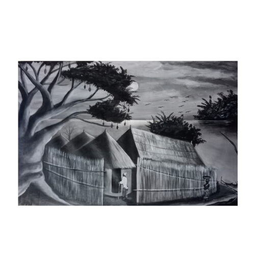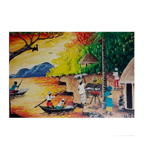 Harmony in motion is a captivating painting that celebrates the rich cultural heritage and vibrant spirit of African women. In the foreground, a group of women, adorned in traditional garments and accessories, come to life as they dance with exuberance. The dominant color palette of the painting, a tranquil grey-blue, creates a sense of calm and unity. Each woman’s attire is a testament of their cultural pride, which intricates patterns and vibrant hues that pay homage to their heritage. Their accessories, including beaded jewelry and headpieces, add a touch of authenticity and elegance to their appearance. However, what truly steals the viewers attention is the brilliant burst of orange light in the center of the painting. This radiant glow bathes the dancers in warmth and intensity, accentuating their movements and creating a mesmerizing contrast against the cool blue background. It symbolizes the energy, passion, and vibrancy of their music and dance. As the women play traditional instruments, the air seems to fill with the sounds of rhythm and melody. “Harmony in Motion” is a visual celebration of culture, tradition, and the power of music and dance to unite and uplift. the interplay of cool blues and fiery oranges creates a harmonious visual symphony that invites viewers to feel the rhythm of life and appreciate the beauty of diversity.