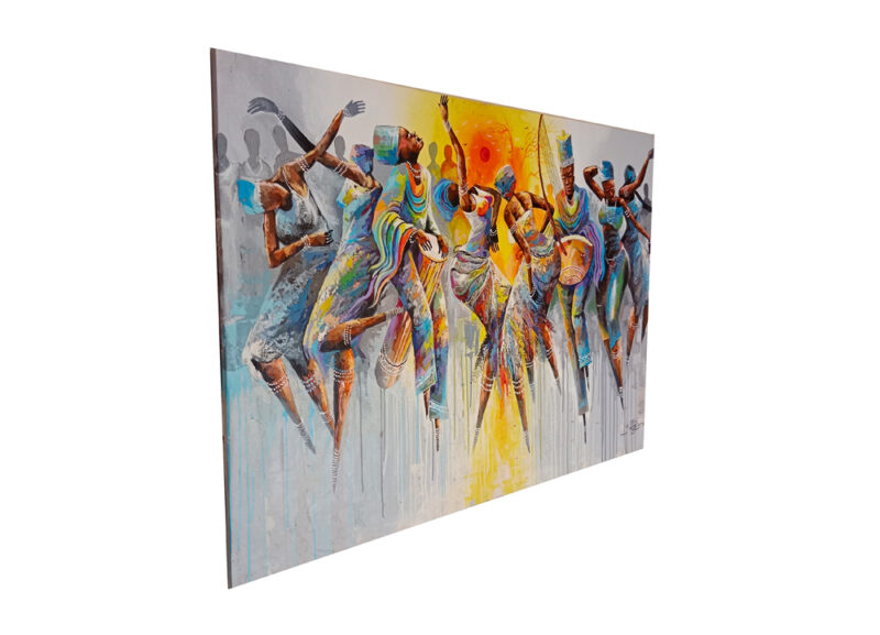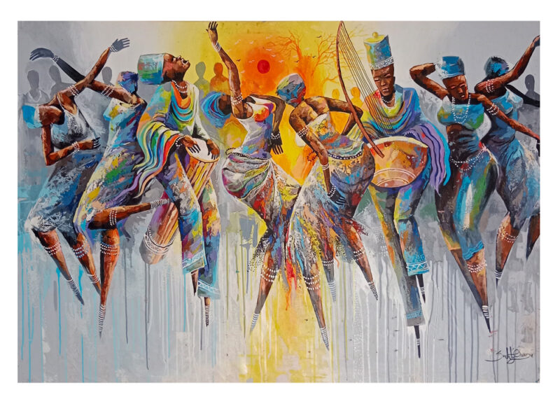 Harmony in motion is a captivating painting that celebrates the rich cultural heritage and vibrant spirit of African women. In the foreground, a group of women, adorned in traditional garments and accessories, come to life as they dance with exuberance. The dominant color palette of the painting, a tranquil grey-blue, creates a sense of calm and unity. Each woman’s attire is a testament of their cultural pride, which intricates patterns and vibrant hues that pay homage to their heritage. Their accessories, including beaded jewelry and headpieces, add a touch of authenticity and elegance to their appearance. However, what truly steals the viewers attention is the brilliant burst of orange light in the center of the painting. This radiant glow bathes the dancers in warmth and intensity, accentuating their movements and creating a mesmerizing contrast against the cool blue background. It symbolizes the energy, passion, and vibrancy of their music and dance. As the women play traditional instruments, the air seems to fill with the sounds of rhythm and melody. “Harmony in Motion” is a visual celebration of culture, tradition, and the power of music and dance to unite and uplift. the interplay of cool blues and fiery oranges creates a harmonious visual symphony that invites viewers to feel the rhythm of life and appreciate the beauty of diversity.