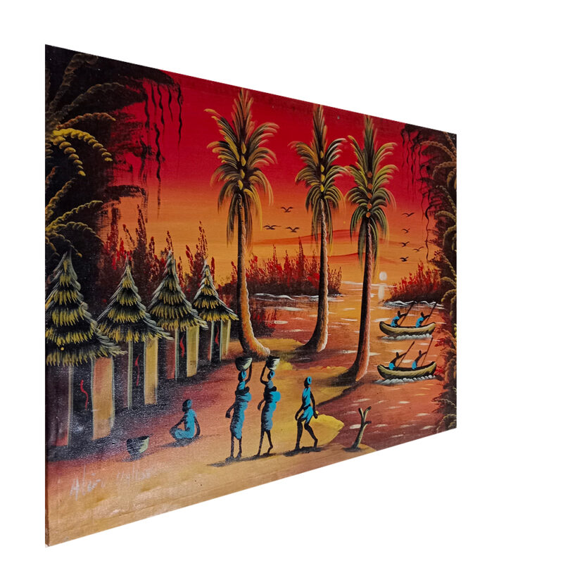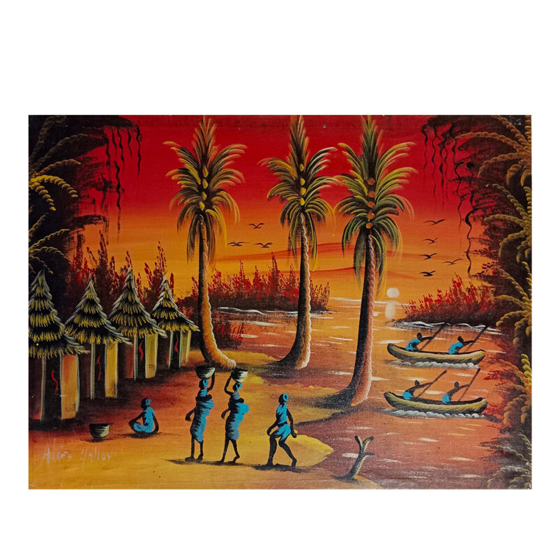 This series of paintings beautifully contrasts the vibrancy of African village life. Some are awash with brilliant vivid colors, while others portray the same scenes in serene black and white. Within these canvases, an African community thrives around a picturesque lakeside. Engaged in their daily chores, they move through their activities with a sense of calm and serenity. The lush natural surroundings, with a shimmering water source, trees and vibrant greenery, provide the backdrop for a harmonious existence. Wether in color or monochrome, the paintings capture the timeless beauty of this tranquil way of life.